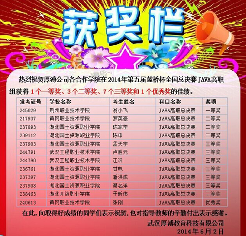 目前,2014年第五屆藍(lán)橋杯全國軟件和信息技術(shù)專業(yè)人才大賽成功落幕,現(xiàn)個人賽獲獎名單已經(jīng)在大賽官網(wǎng)公布。武漢厚溥教育科技有限公司合作院校有12名大學(xué)生在本屆藍(lán)橋杯總決賽中榮獲佳績!